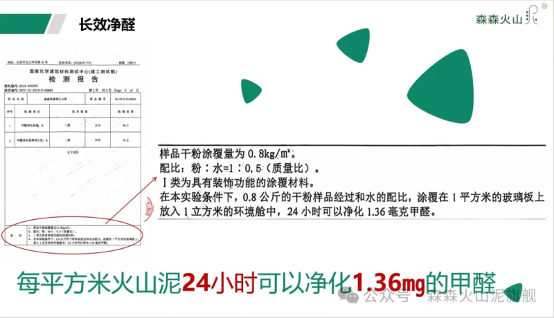 森森火山泥打破传统涂料释放甲醛等有害物质的限制,产品通过国家建筑材料测试中心检验,无毒无害,无放射性,是真正的绿色建材。